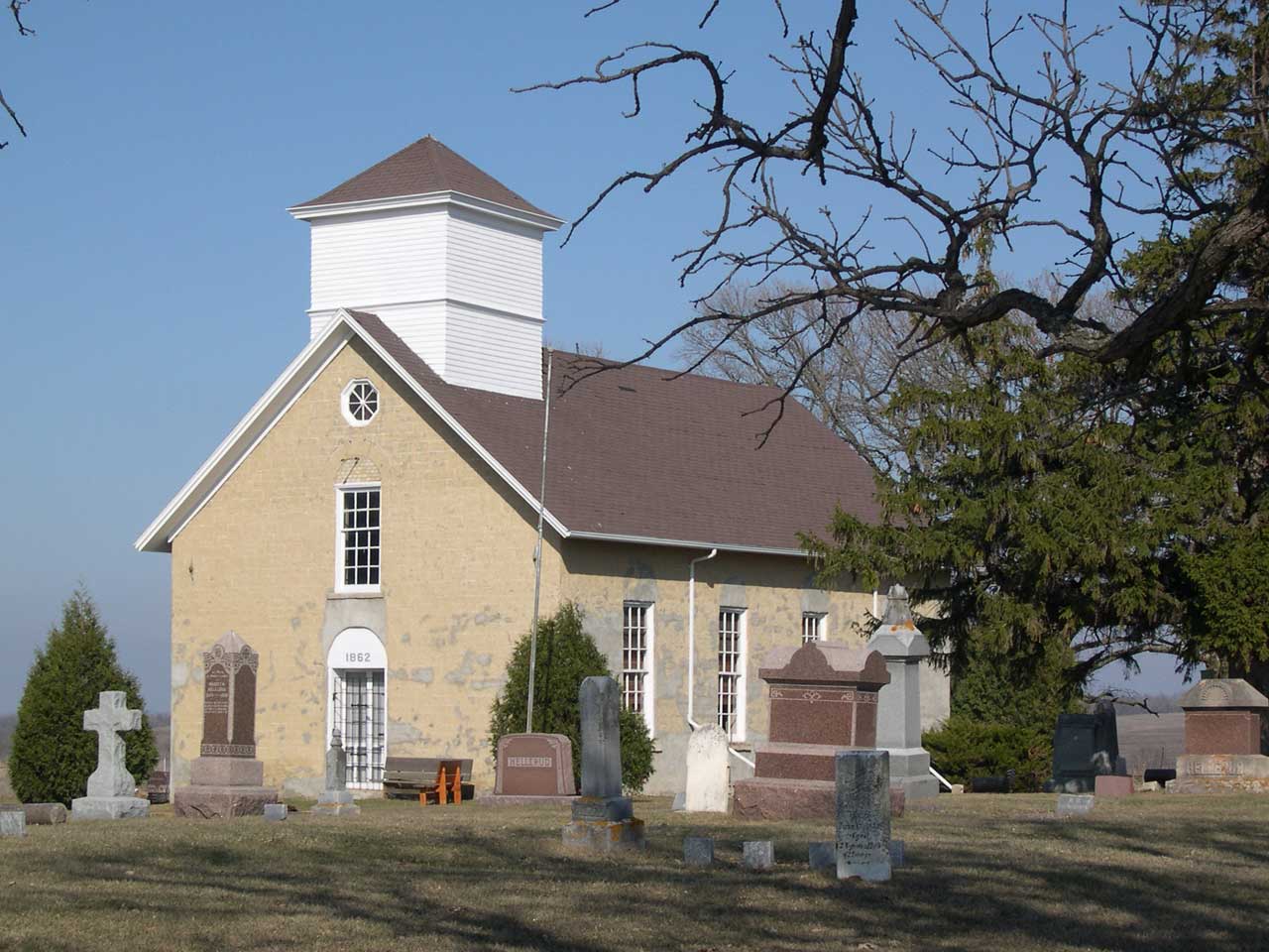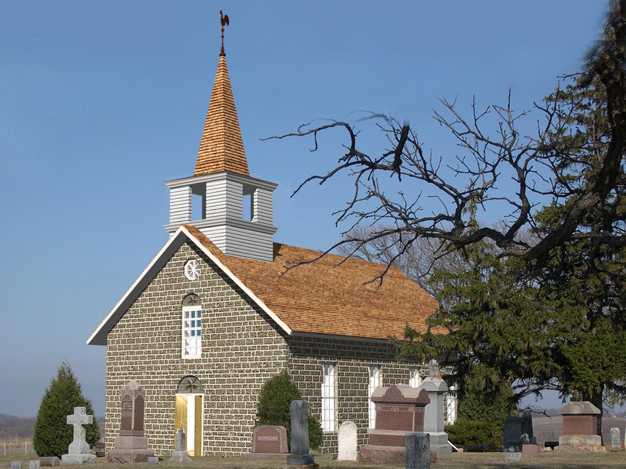 The 3D model of the restored church has been inserted into a photo showing the trees and grave markers as they are today. The model’s near-perfect stone texture was taken from an 1872 photograph of the church.