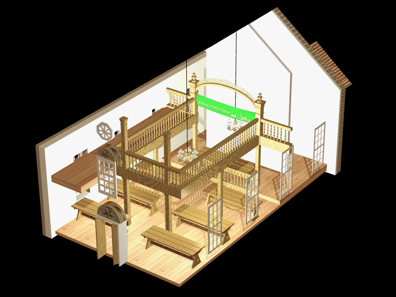 The interior is where the most significant changes will occur. Note the opened ceiling, balcony, ornate carved arch, chandeliers, and spindles.